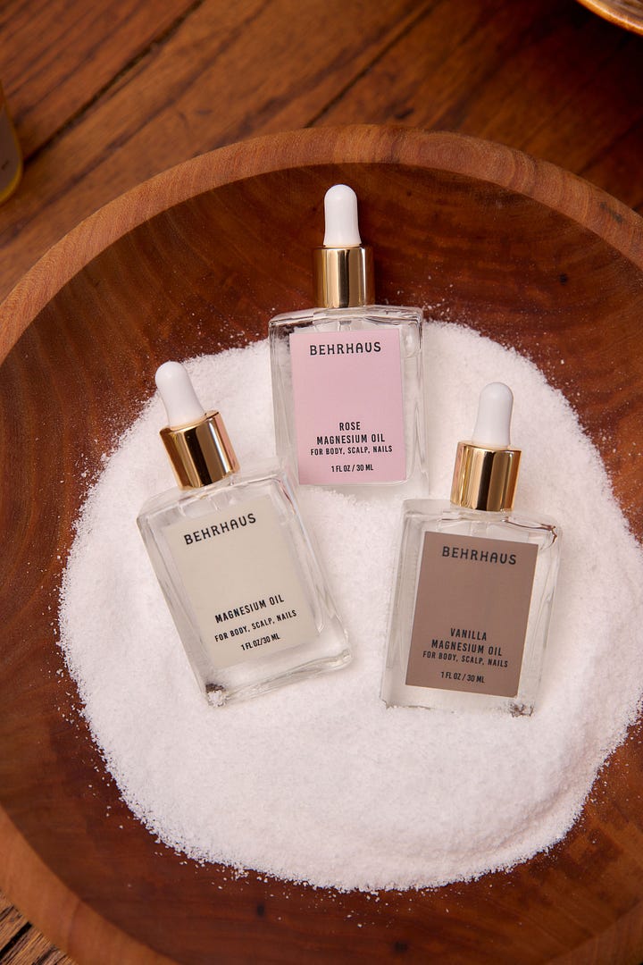 Behrhaus magnesium oil. After reading that most of us are overdosing on melatonin, I started looking for alternatives. Enter Lauren Behringer, a celebrity aesthetician and health coach who founded Behrhaus, a clean skincare line. The magnesium oil has become a nightly ritual for me and my oldest, who now requests a foot rub with it every evening.